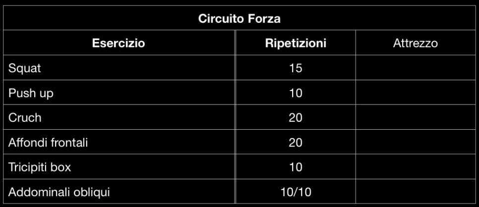 Oltre alla colonna “Esercizio” che contiene il nome dell’esercizio, potete trovare la colonna “Ripetizioni” che indica il numero di volte che un singolo esercizio deve essere ripetuto. Infine la colonna “Attrezzo”, nel caso servissero attrezzi tipo Manubri o simili per svolgerlo.